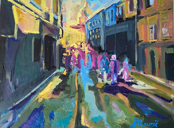 This painting captures the energy of a sunlit street, alive with movement and color. I wanted to evoke the feeling of walking through a bustling city, where light bounces off the buildings and dances across the pavement. The composition draws the eye toward the glowing center, where figures suggested rather than defined move together, immersed in the rhythm of urban life.