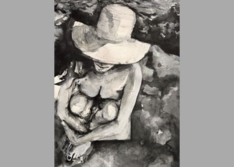 The figure’s nudity is not meant to provoke but to reveal she is unguarded, yet not exposed. The hat, a recurring motif in my work, becomes a shield here, a veil that turns the gaze inward rather than outward.