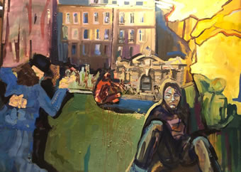 The dancing couple to the left represents the world moving on, filled with connection and joy, while the seated figure feels stuck longing to belong but unable to. This contrast is something I wanted to explore, the tension between being physically present yet emotionally distant.